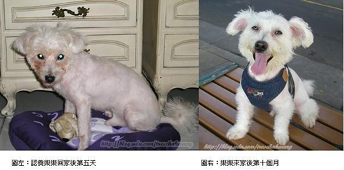 從樂樂跟著福福回家後,在這近一年內,總共只做了兩次大美容,還去做了四次小美容。他剛來的時候,全身被蟲蟲咬傷,毛髮糾結得很嚴重,全身剃光,只有頭和尾巴稍作修剪;然後開始慢慢把毛髮留長,近半年後(也就是農曆過年前)他的毛髮已有些長度,於是送他去做大美容,跟美容師討論過後,剪了一個方便以後留長後會很有形的造型。