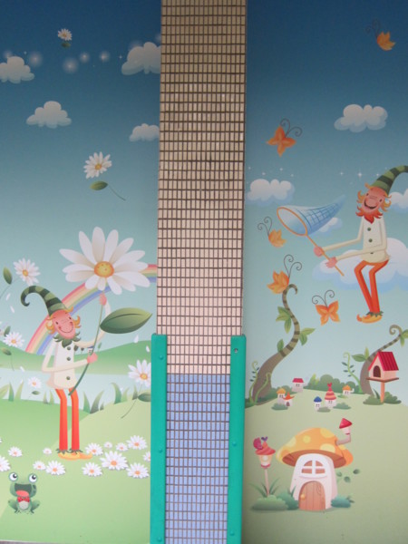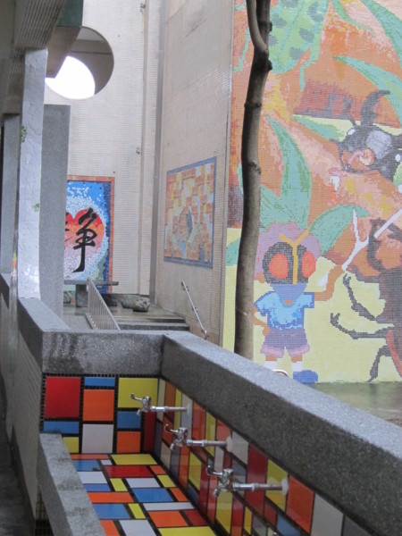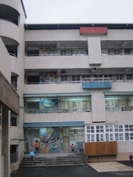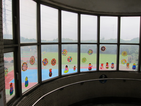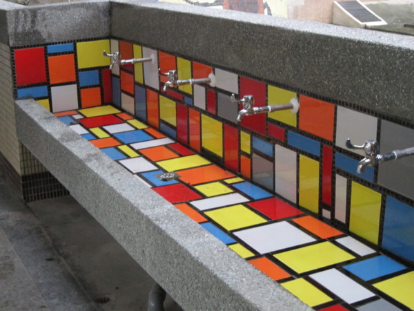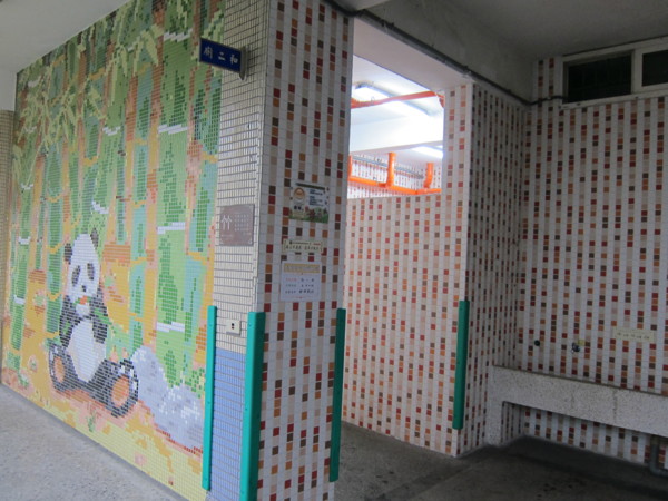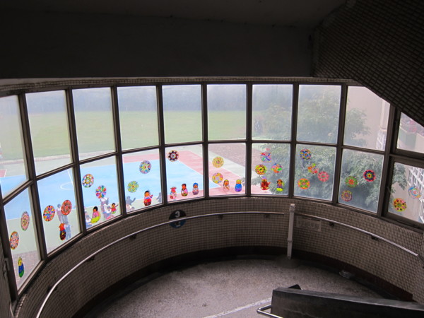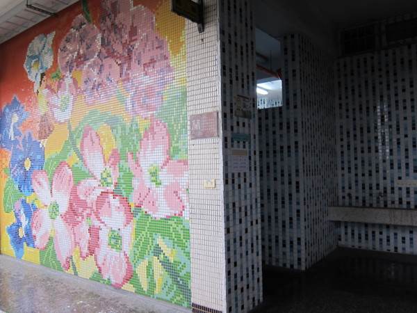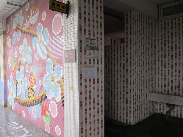 走進園區廊道,映入眼簾的是手工仿古陶片入口意象,樑柱上有典雅、保留原色的掛式陶盆;洗手台用的是中國景德鎮的青花盆搭配彩色瓷磚色塊,廊道上有四組花瓶,象徵營造快樂平安的童年。