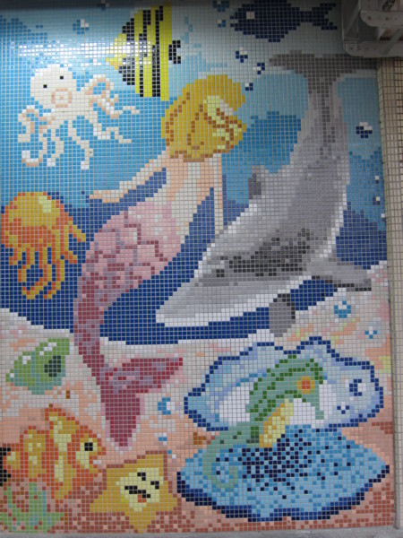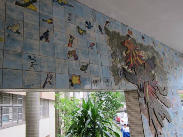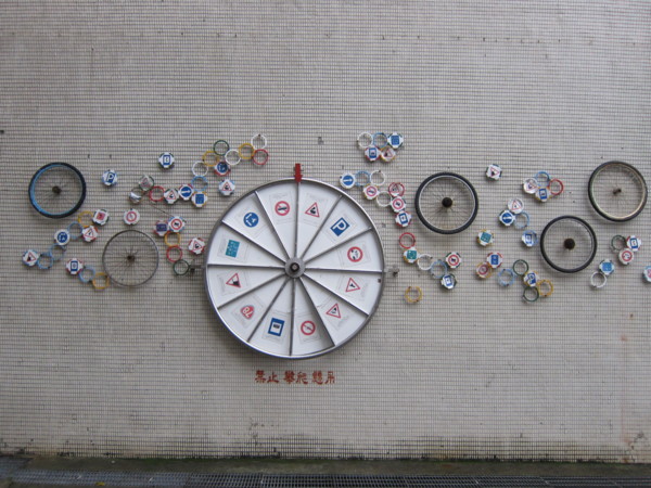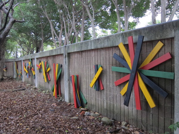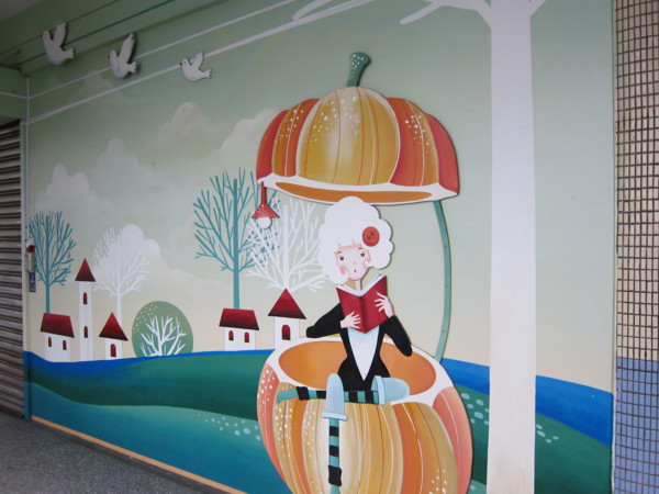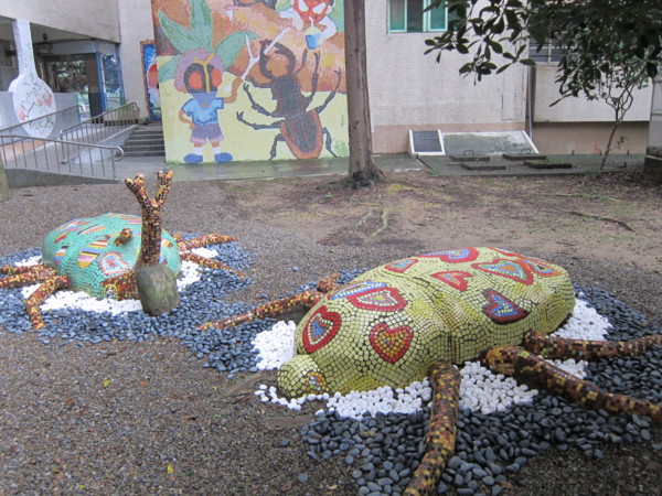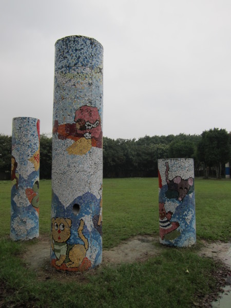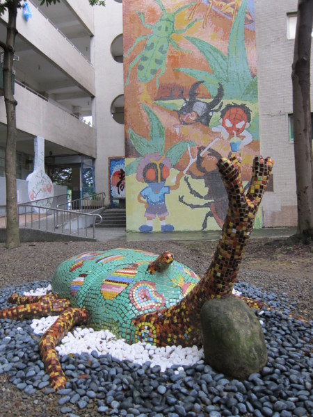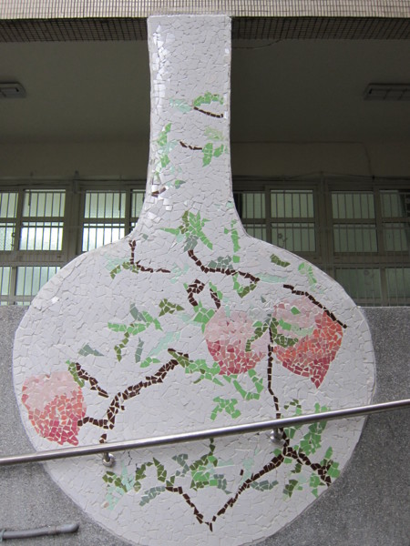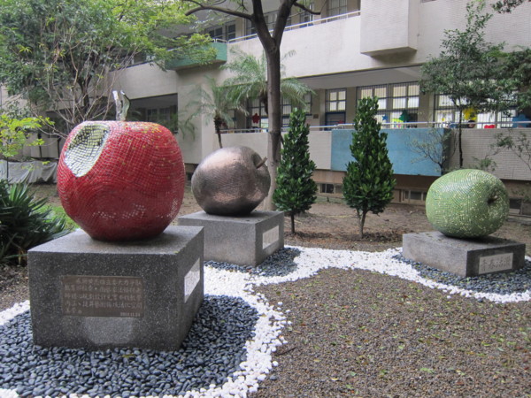 一旁綠地以陶塑及馬賽克拼貼三顆大蘋果,象徵「幸福平安」,也代表「改變世界的三顆蘋果」:聖經中亞當夏娃的蘋果傳說、砸到牛頓的蘋果、賈伯斯的蘋果科技產品;分別以紅、青、金三色,代表「熱情沉穩」、「青春活潑」及「優質創新」。