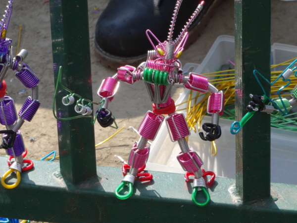 在上海浦東芳甸路上的大拇指廣場, 常會有一個年青人在綠化帶上擺賣他用各色鐵絲製成的工藝品, 做的不賴, 要價也不算高, 像照片裡的變形金剛, 一個喊價100RMB(約合500台幣), 你有心要買了, 殺殺價, 七十八十都好說的.