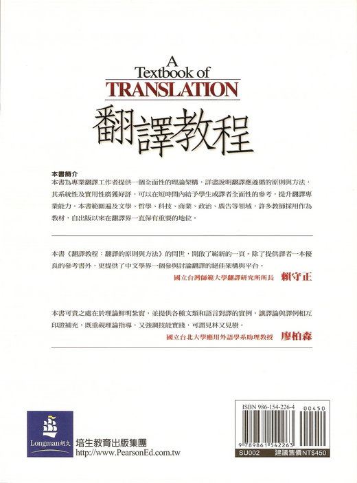 直至培生教育出版公司翻譯出版國際著名的翻譯理論和教學專家Peter Newmark的大作《翻譯教程》(A Textbook of Translation),我們總算可以確定,國內眾多翻譯教師對於優質翻譯教科書的需求期待終於可以得償。原書作者Newmark出生於捷克斯拉夫,幼時移民至英國,及長畢業於劍橋大學後從事英德、英法等歐語之間的翻譯工作。其後曾任中倫敦理工學院(Polytechnic of Central London)語言學院院長和語言學家學會(Institute of Linguists)的會長,學術地位崇隆,在翻譯理論、實務和教育工作上皆卓有建樹。他的著述雖然不多,但每本書都是擲地有聲,深具份量。其中在翻譯教學上的代表作即是此《翻譯教程》,本書曾榮獲英國應用語言學學會獎,並譯成數國語言(如希臘文、西班牙文等)。筆者過去在師大譯研所以及赴美攻讀博士期間所修的翻譯課程,亦都以此書為指定教材,足證該書風行之程度。如今得見中文版本問世,欣喜之餘,相信定能嘉惠更多華文圈有志修習譯學的人士。