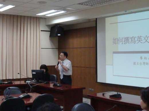 本次演講主要分為兩大部分:(一)研究論文寫作特色及格式介紹;(二)搭配詞及語料庫介紹。首先,廖柏森副教授就點明了研究論文的寫作有其獨特性,學術英文是種特定的文體,不同研究領域寫作雖有內容上的差異,但文字表達或章節格式具備某些共同依循的邏輯和準則,以提高寫作和閱讀論文的效率,也因具有客觀性,才有教學和研究的基礎。