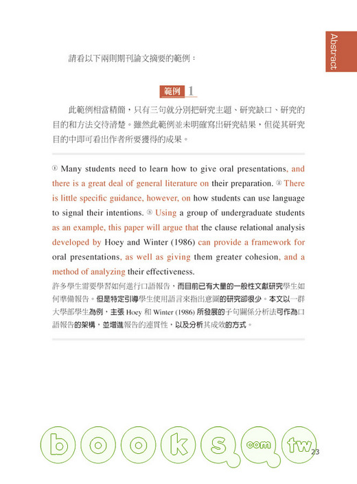 全書依論文標準架構IMRD格式編排,寫作者除了可以清楚了解論文架構,更能按圖索驥,方便查詢不熟悉的篇章。