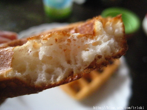 口感而言,很明顯的外酥內軟。外酥的感覺跟比利時發酵鬆餅這個食譜的成品差不多;