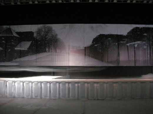 與舞台同大的照片,也是郭英聲的設計作品,背景是法國諾曼地街道,剛好也下雪的雪景與舞台互相搭配,而且特別製造的煙霧效果,如幻似真,也算是國內大秀的創舉囉。