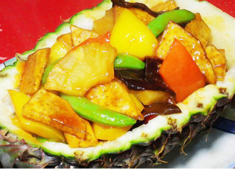 材料準备:甜豆、木耳、芋头片、红椒、黄椒、凤梨半颗(挖好果肉备用)、凤梨罐头、姜末