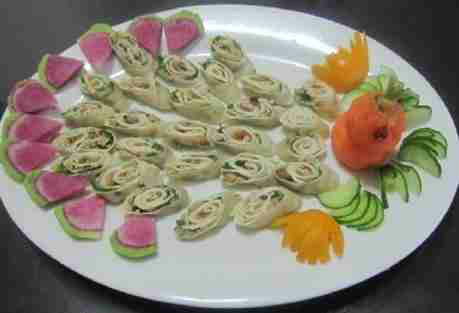 3、豆卷冷却后改刀,摆盘,用洗净、略焯烫过的金桔、圣女果、胡萝卜做的孔雀头装饰即可。