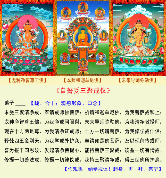 “弟子____求受三聚清净戒,奉请戒师佛菩萨:祈请释迦牟尼佛,为我菩萨戒和上;龙种净智尊王佛,为我净戒阿阇梨;未来导师弥勒佛,为我清净教授师;现在十方两足尊,为我清净证戒师;十方一切诸菩萨,为我修学戒伴侣;释梵四王金刚天,为我学戒外护众。奉请如是佛菩萨,及以现前传戒师,普为报于四恩故,发起清净菩提心,能持菩萨三聚戒:饶益一切有情戒、修摄一切善法戒、修摄一切律仪戒,我持三聚清净戒,得三世佛所护念。”