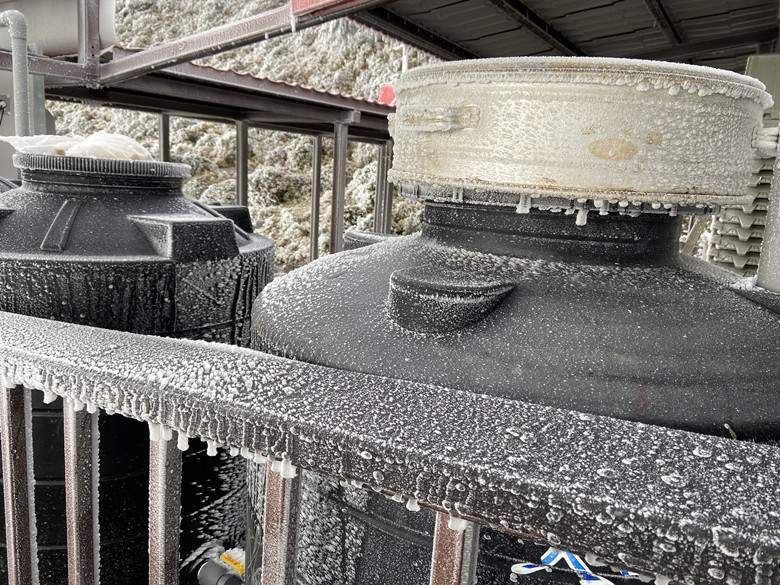 山屋經過一夜催殘後,物品及走道、屋簷全被冰霜給覆蓋成這幅模樣。
