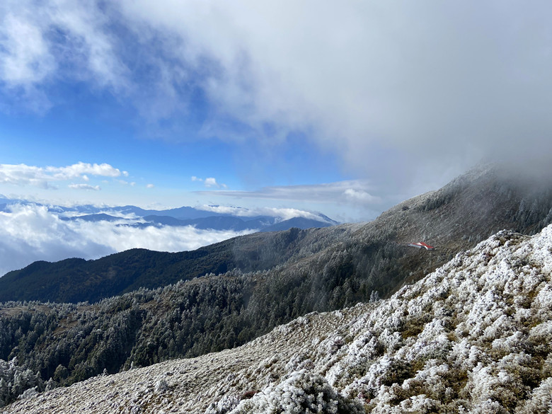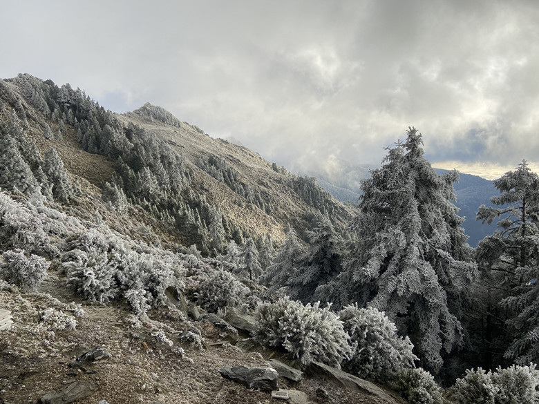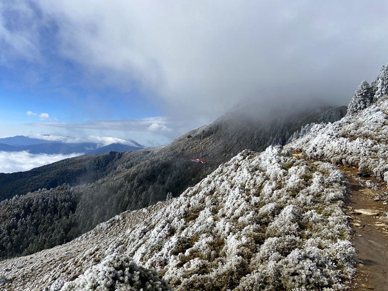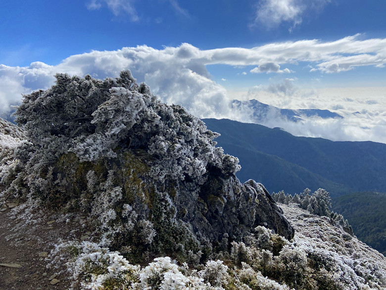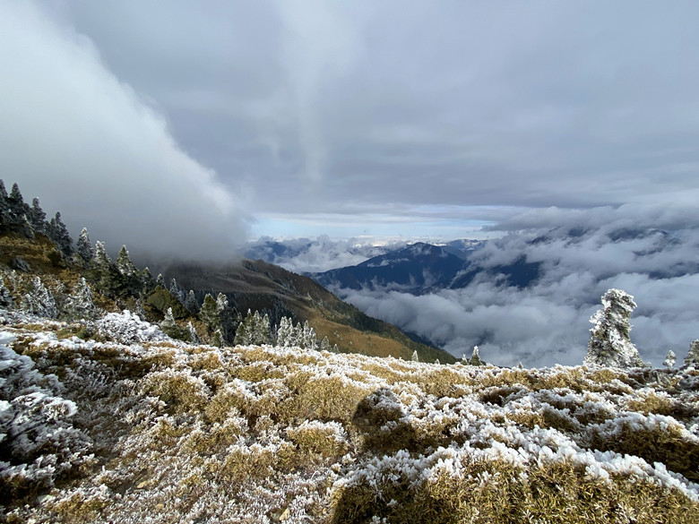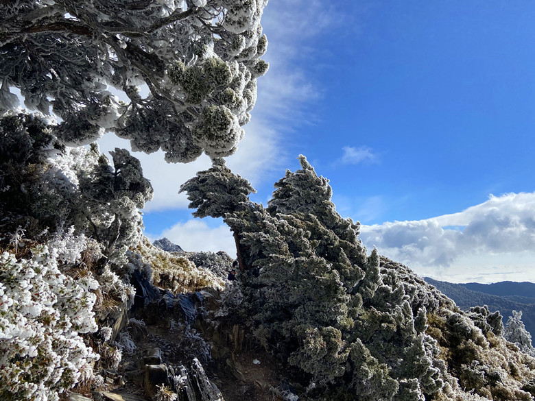 本是想這麼美這麼好的天氣不往嘉明湖走實在太可惜,走著走著當走到一處風口時這個意念馬上消失殆盡,因為寒風刺骨冷到讓人受不了。還是折返好了,沿路拍拍照也好。回到山屋聽到這群年輕人直嚷嚷要衝嘉明湖,待嚮導算算時間,說往返要6~7小時會摸黑,不建議前往,最後大家還是做罷!期待明天能順利登嘉明湖、三叉山。