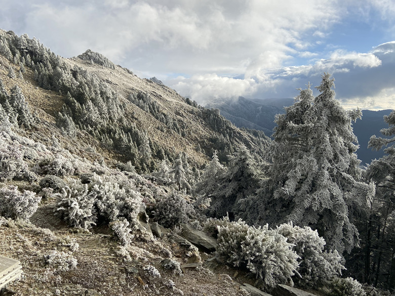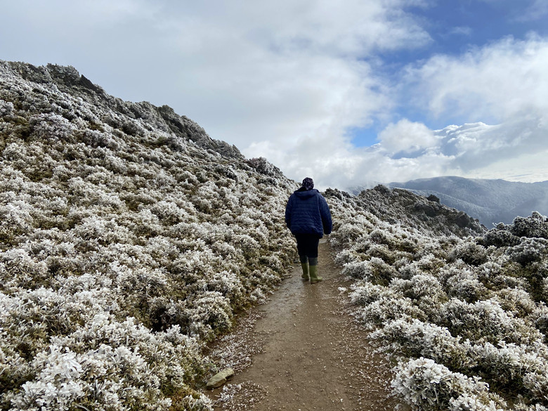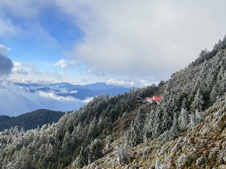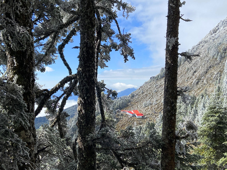 在慢條斯理吃完早餐後,見外面太陽冉冉升起,昨日的風霜雪雨已悄然離去。一踏出屋外所見景致也與昨天大不相同,放在走廊的物品及走道、屋簷全被冰霜給覆蓋,山屋有如被冰封一樣。這時嚮導問有沒有人要出去走走的,結果大家意興闌珊不想離開睡袋,而我則是跑第一。