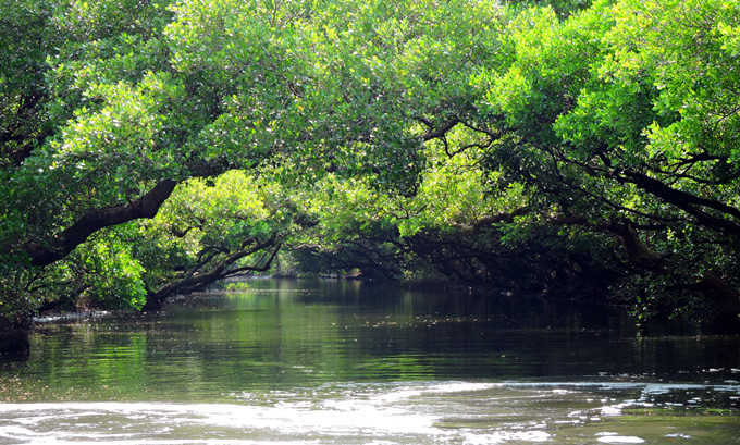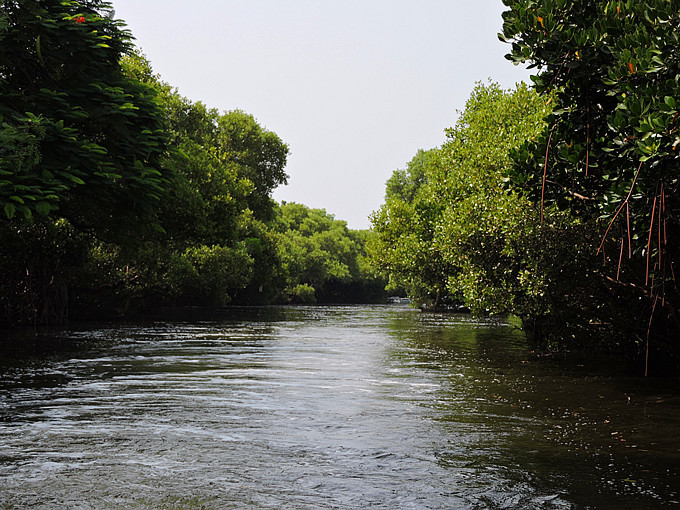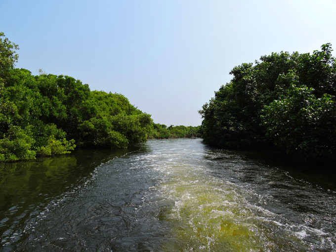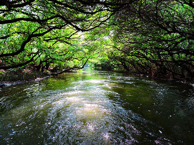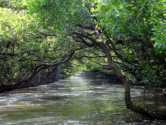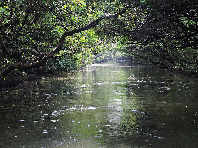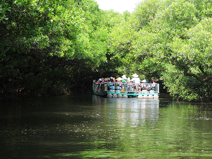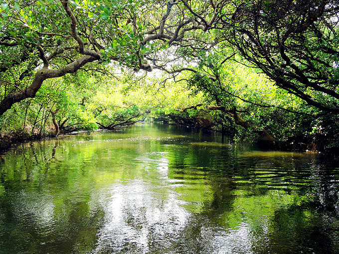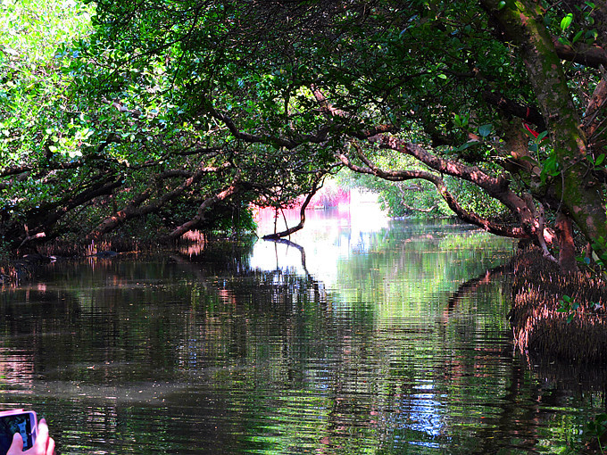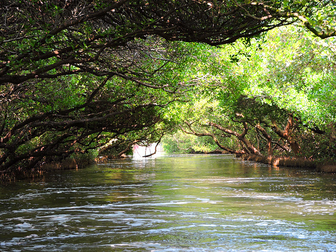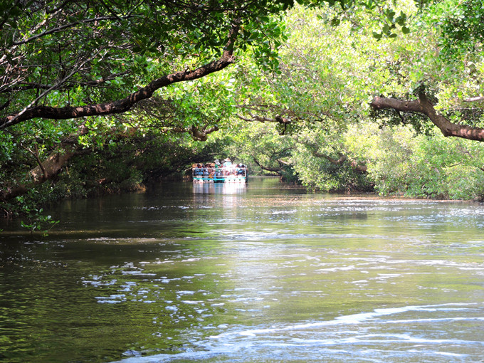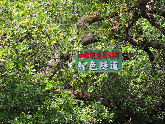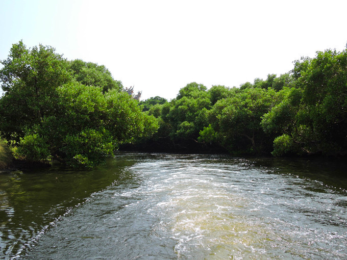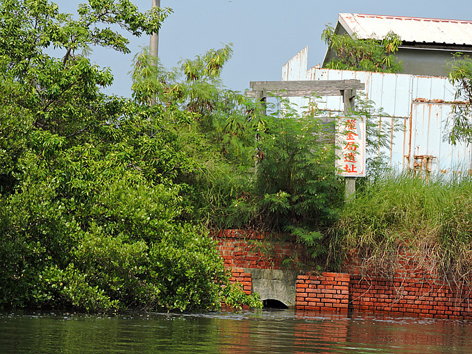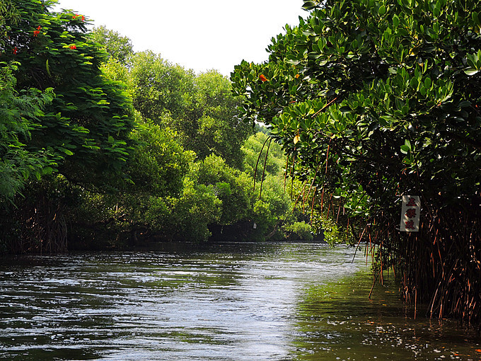 運河邊兩排紅樹林整齊劃一的舉起雙手,在河面上拱成一條綠色隧道,陽光滲透綠色枝椏,把水面照的一閃一閃,有如霓虹燈般閃耀。此刻,它像一個受到過度注目而欣喜異常的肚皮舞孃,猛力甩動全身,而船隻也不由自主的隨它在有節奏的律動下往前滑行。很快的就到釐金局遺址,匆匆的一撇這幾個大字,在未弄清左右時,已是在回航之途,突然感覺這美麗的夢幻似乎太短暫了。能否央求船家把速度調慢呢?讓我這千里迢迢遠道而來的遊客沈浸在這氛圍裡多一點呢?
