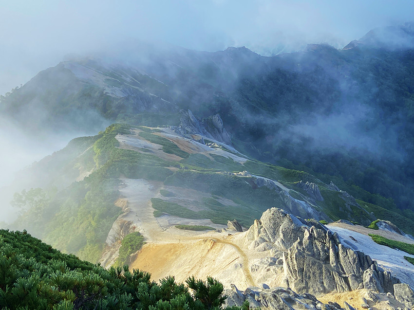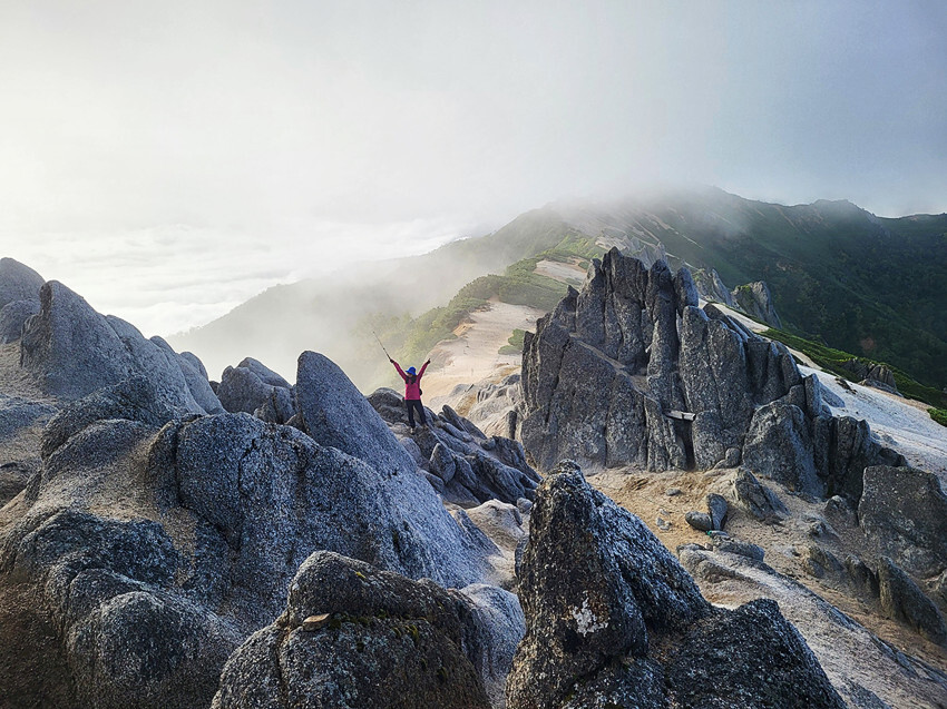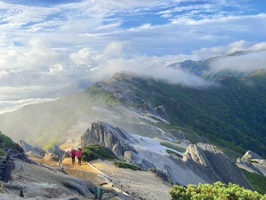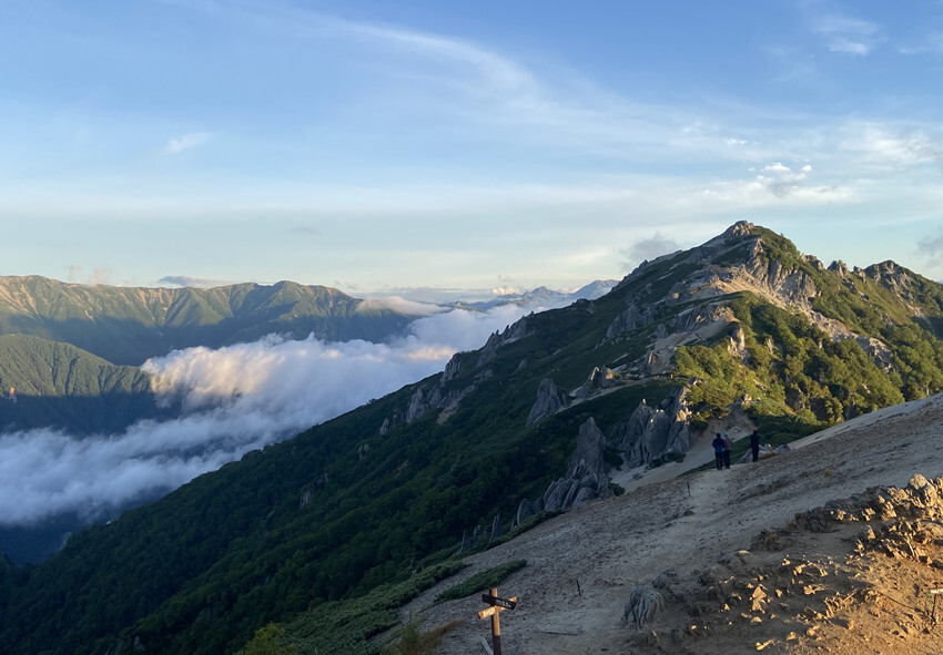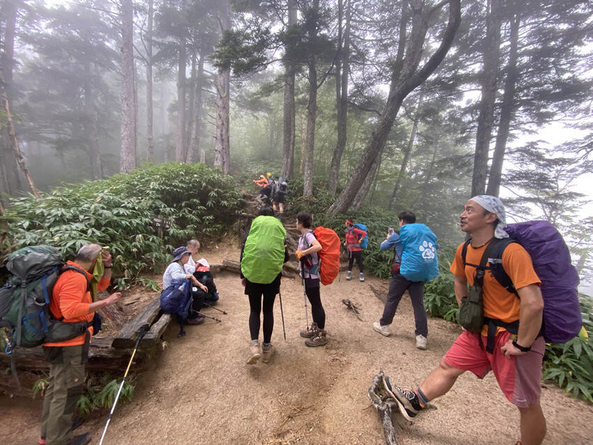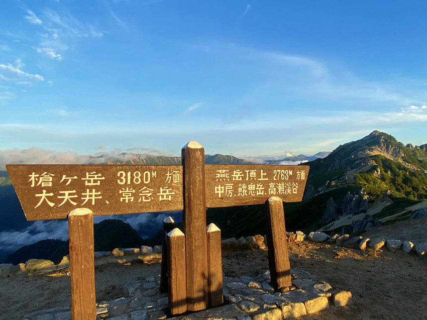 一路氣喘吁吁,當來到燕山莊喜悅之情溢於言表,再來等分配床號安頓好今晚住宿,及享用山莊的晚餐。第二天早餐後往燕岳出發,這時還雲霧繚繞,空氣中有點冷,走著、走著煙消霧散,景觀也一一出現眼前,原來稜線這麼美,視野一望無際,雲海洶湧澎拜,讓人捨不得離開想多待一會,無奈後面還有很長的路要走。