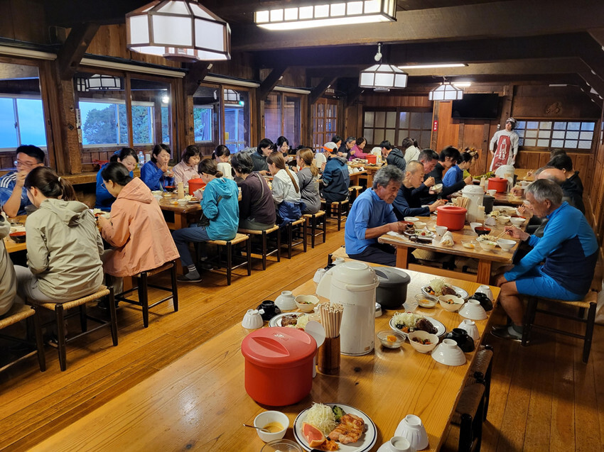晚餐,餐廳滿滿登山客,還須分梯吃。