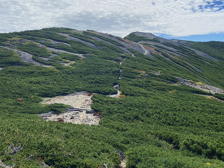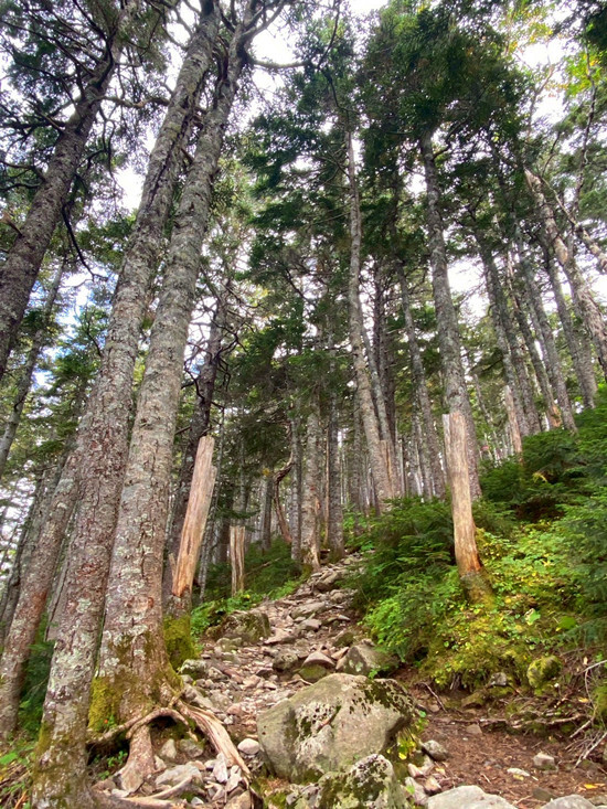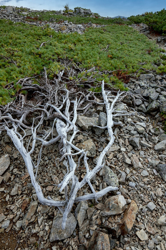 山頂的樹都匍匐前進生長,生命力堅韌,在石礫中也存活的很好。