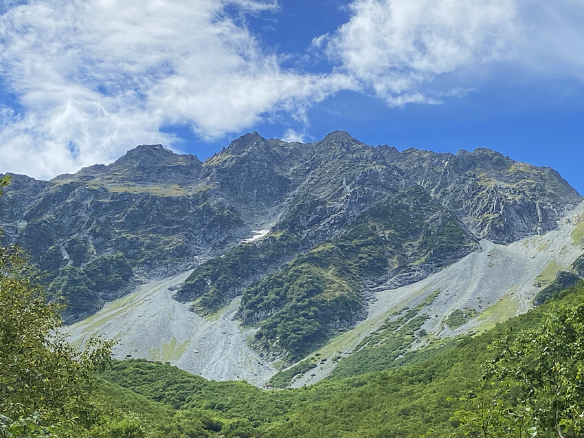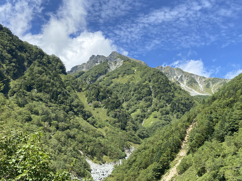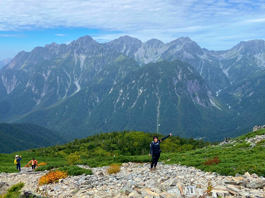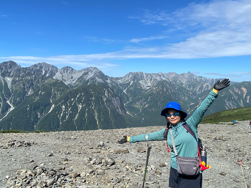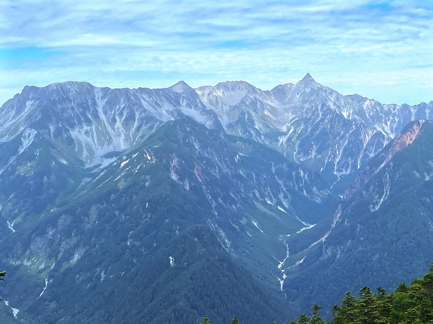 吃完早餐後出發往蝶岳,沿路走在森林裡,一路陡上,走到氣喘吁吁、汗流浹背。當抬起頭時突然前面一遍光明,原來已走出森林,快到稜線了,這時視野也變極為遼闊360度,山巒疊障。下山後背起重重的背包續往觀光勝地,明神池、上高地河童橋出發。
