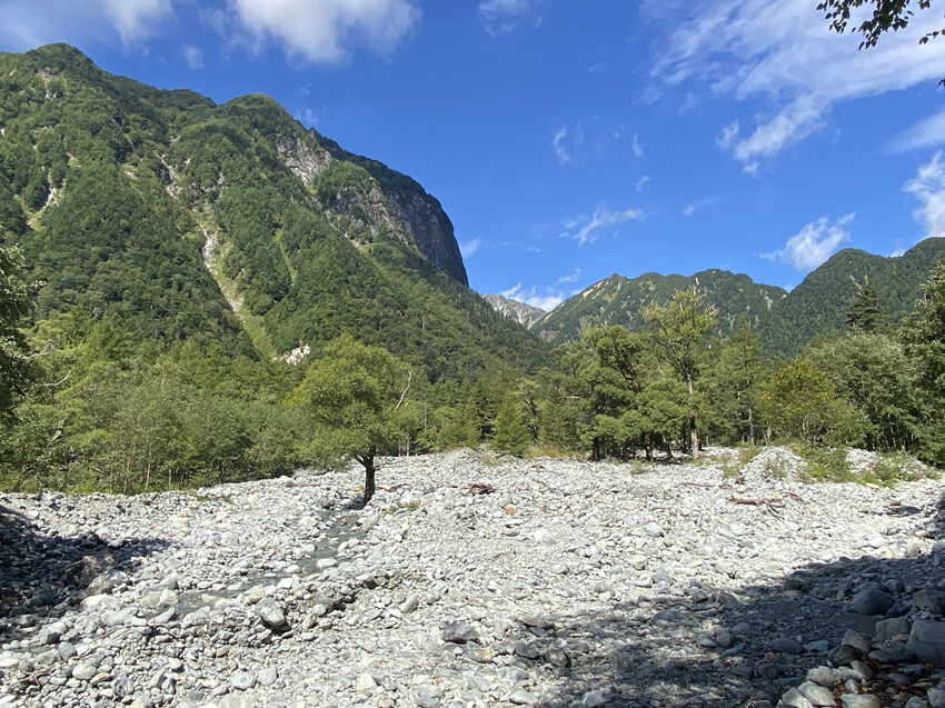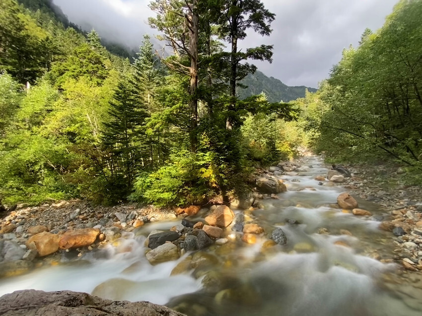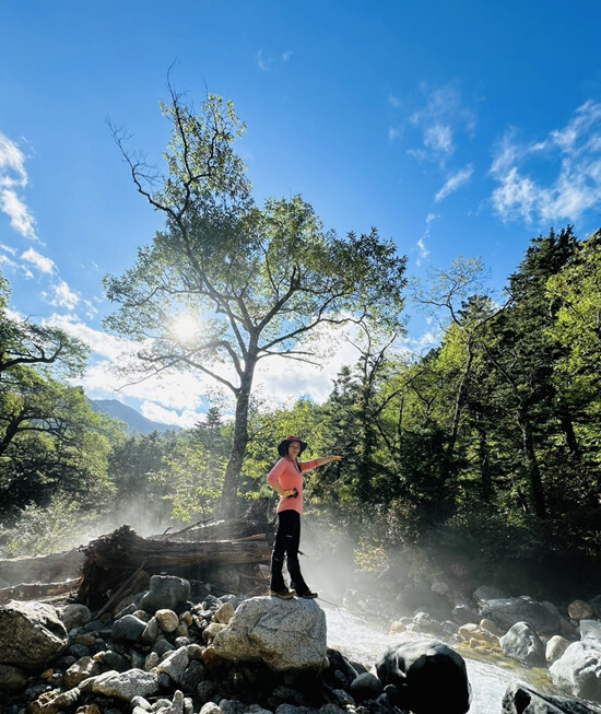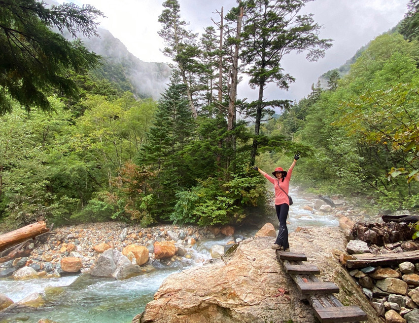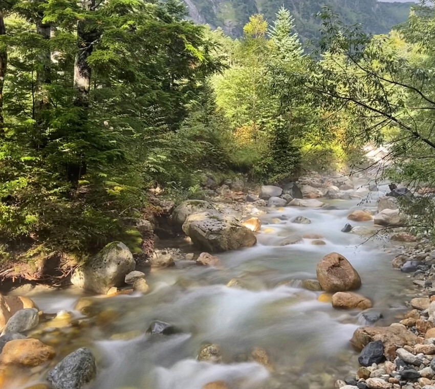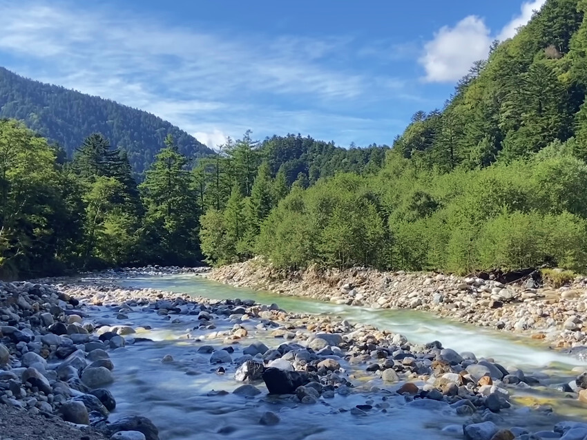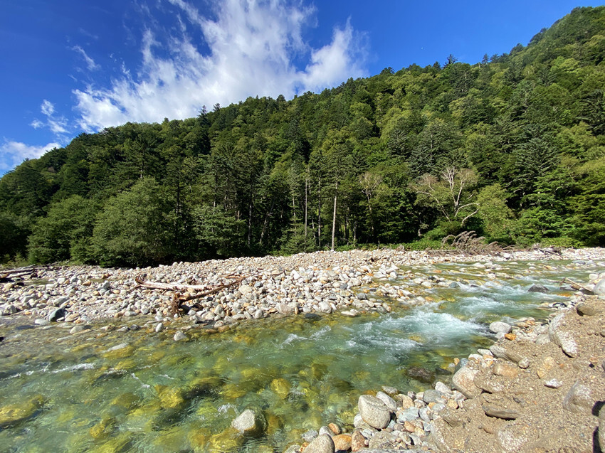 出發後,天氣越來越晴朗,藍天也呼之欲出一路陪伴。因昨天的大雨,使得溪水豐沛,沿路走在梓川溪旁加上陽光灑下,那氤氳靉靆,變得好美、好夢幻,不時都想停下腳步好好欣賞一番。