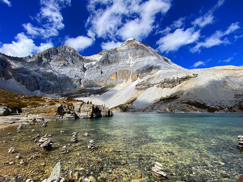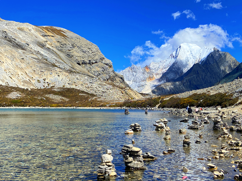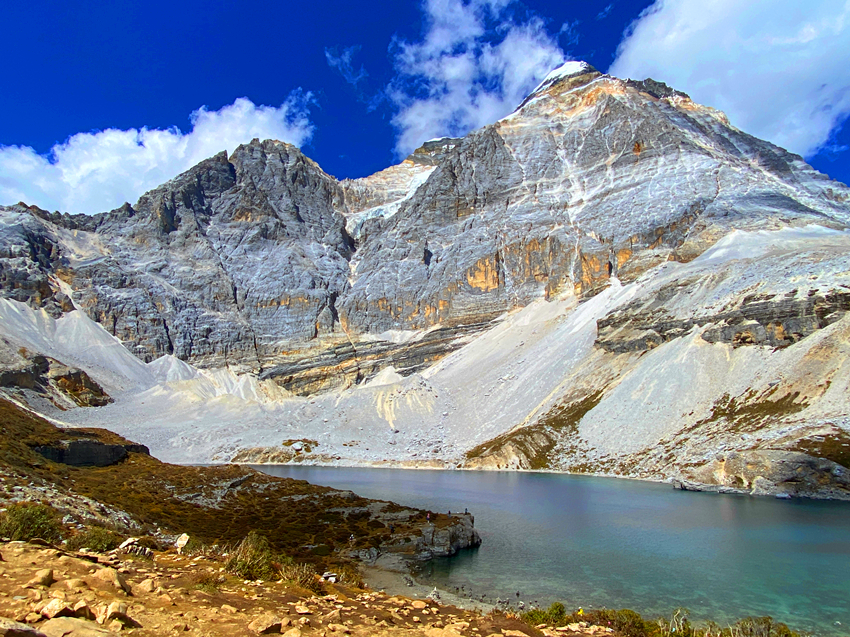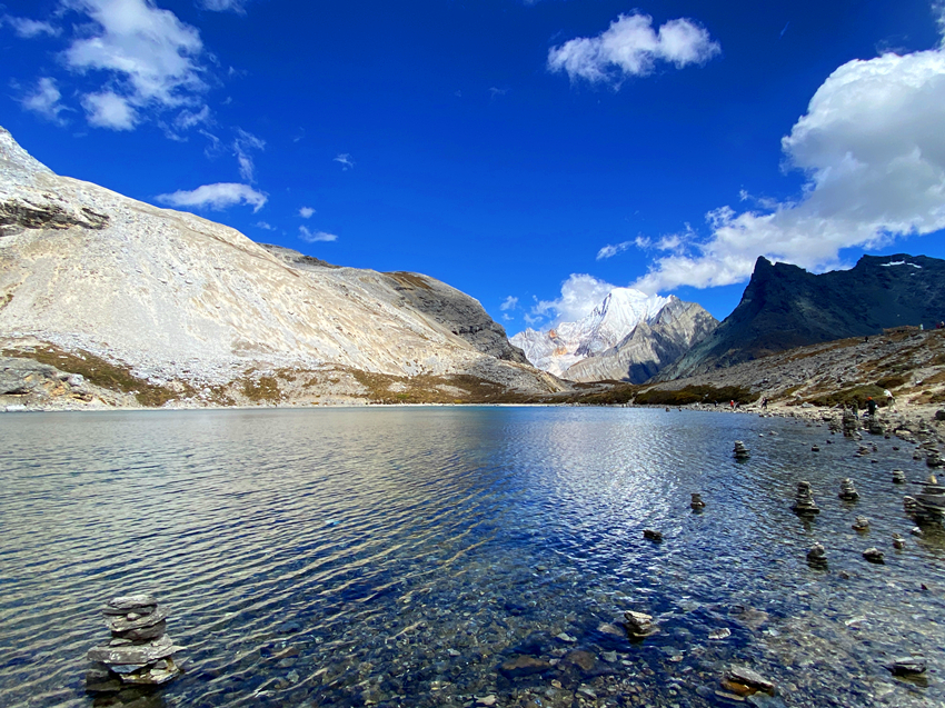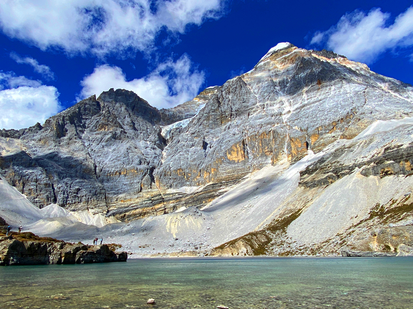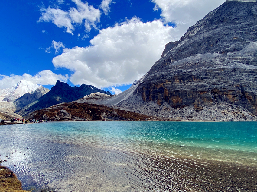 五色海海拔有4700米,它位於牛奶海上方,仙乃日與央邁勇兩大神山之間,湖水清澈,陽光照射下,湖光瀲灩,色彩繽紛,呈現五種不同的色彩而得名。
