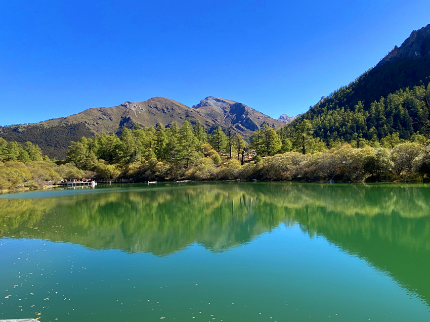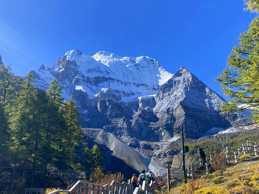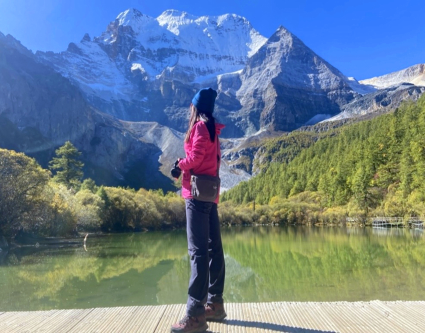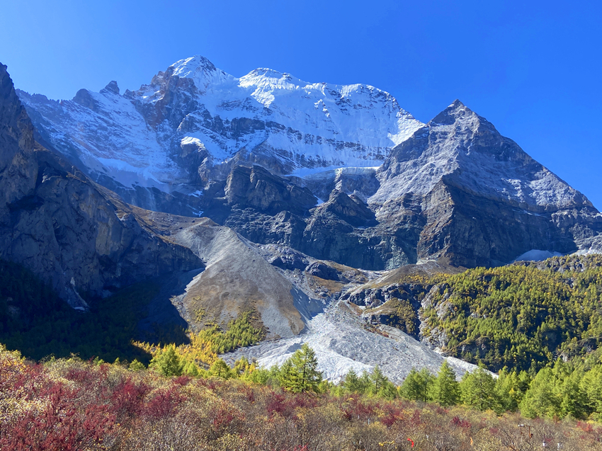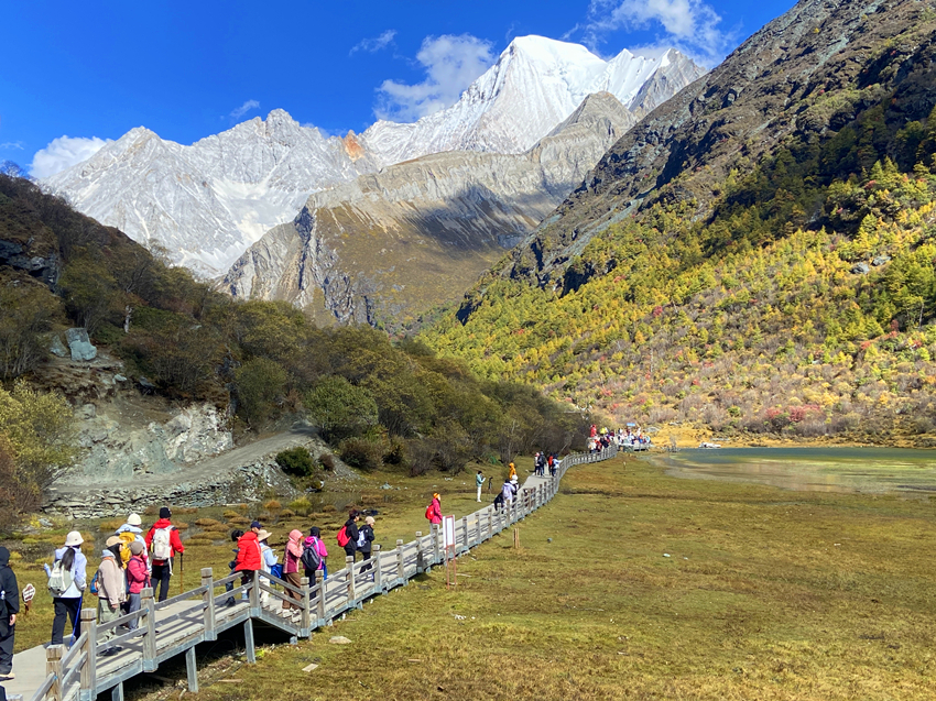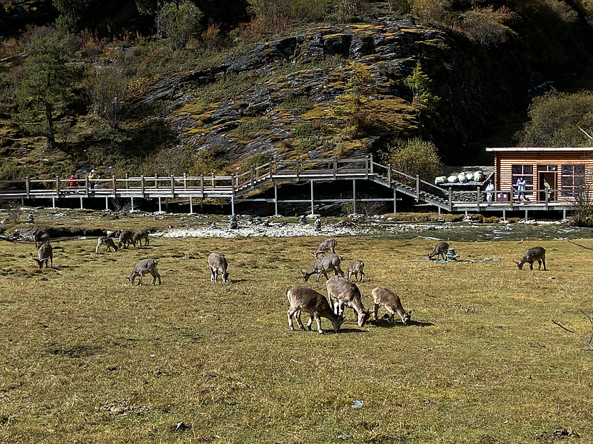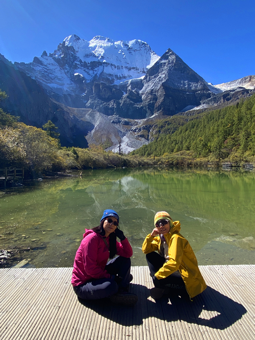 第五天二次進稻城亞丁景區走另一條路線,沖古寺、仙乃日山下卓瑪拉措聖湖,一樣搭接駁車上山,人潮一樣如織,氧氣瓶、氧氣袋一個比一個多。響導帶我們走人煙稀少的步道拾級而上,沿途鳥類、猴子、松鼠頗多且不怕人,甚至鳥兒還會在面前盤旋。午餐就在卓瑪拉措聖湖旁享用,欣賞湖光山色,也深深被仙乃日神山的氣勢磅薄所吸引。