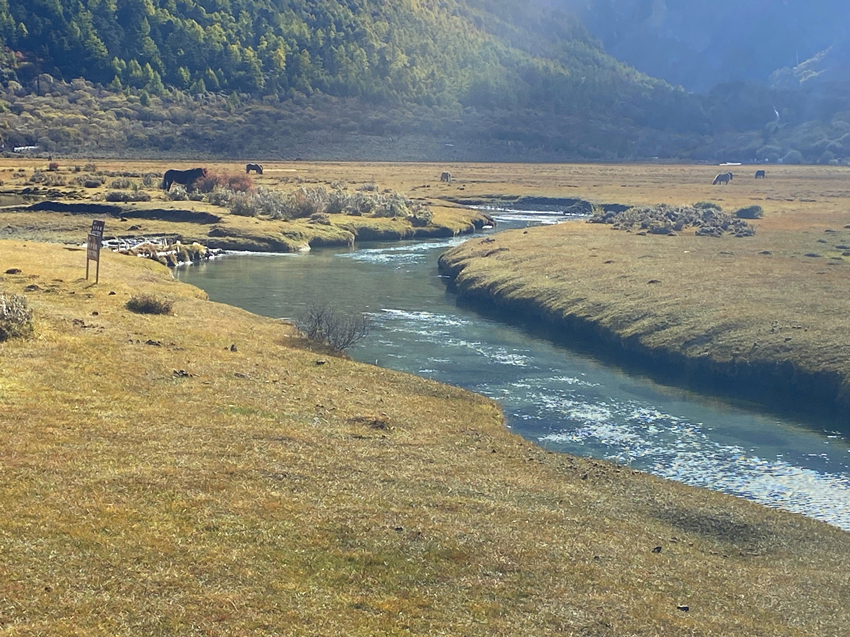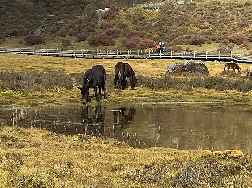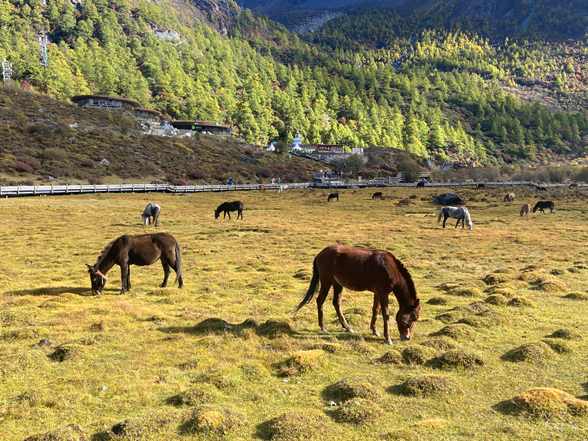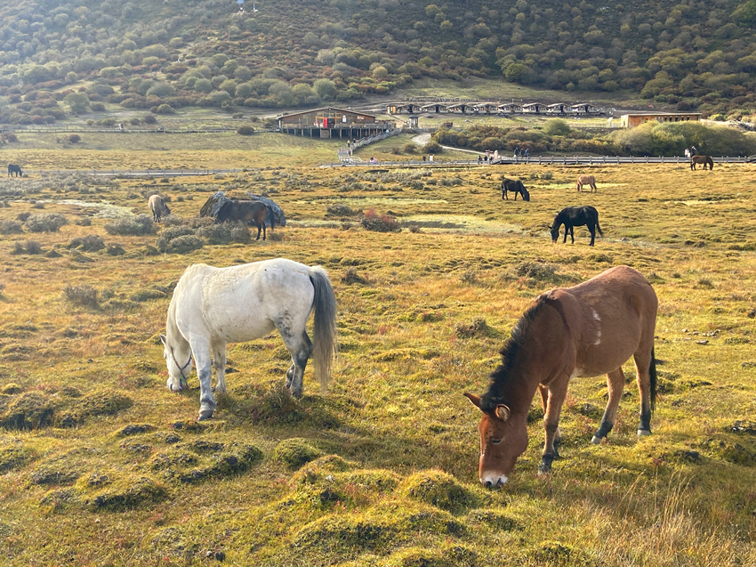 回到集合點跟領隊借了行動電源,又馬不停蹄地往洛絨牛場方向走,既然來到這邊不逛一下著時可惜,雖然時間有限只能走馬看花,但畢竟有逛過。牛場一片寂靜氛圍,只見馬兒低頭專心吃著草,心情也跟著放鬆許多。