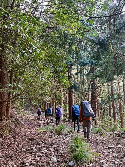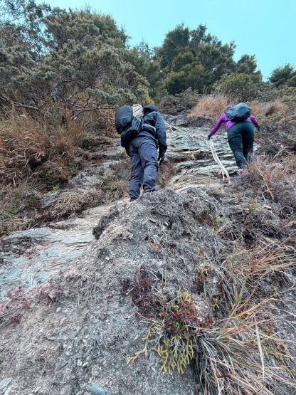 這次重返通往卑南主山的路上,比想像中更像一場漫長的修行,領隊深怕重蹈覆轍,則請同行隊友每人幫忙背四公升的水上山,本重裝的背包已很重再加上水重量,真叫人吃不消,走得更艱辛。石山林道的荒廢、倒木與刺柏的拉扯,彷彿是山在考驗:「你真的準備好要帶走那塊失落的拼圖了嗎?」