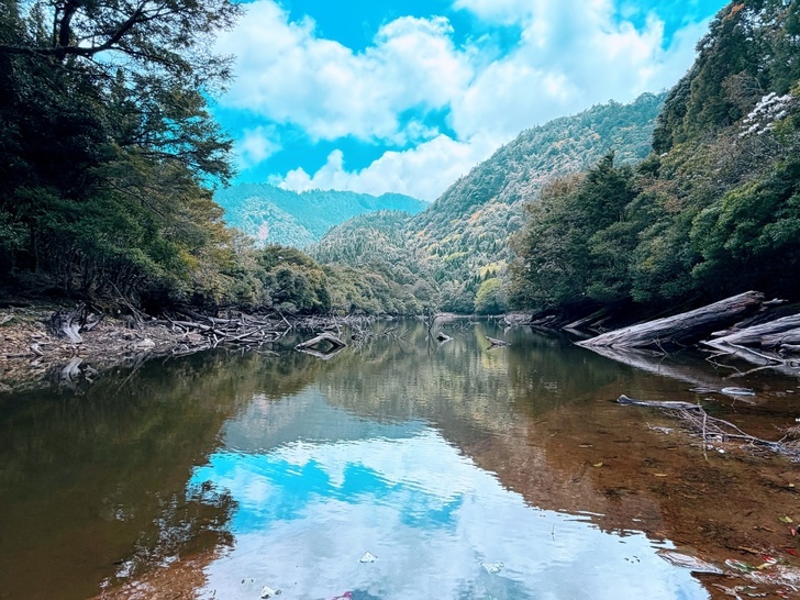石山秀湖這座隱匿在原始林間的夢幻湖泊,扣人心弦得讓人忘了疲憊。看著那水平如鏡的水面,我突然意識到,這趟補考的意義,不僅在於那座南端的巔峰,更在於這份失而復得的從容。湖面靜謐得連一絲漣漪都像是驚擾,倒映在水裡的冷杉,比真實的樹林更顯深邃。所謂的圓滿,不只是抵達那個座標上的三角點,更是能在這座夢幻的湖泊旁,安靜地聽一次自己的心跳。