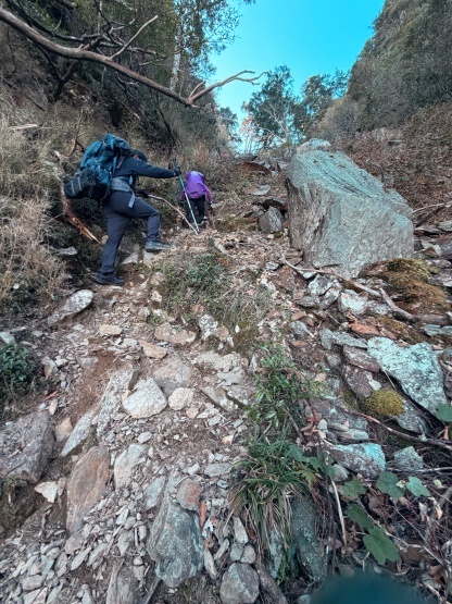 這段陡坡全是碎石坡,下切走得膽戰心驚,步步為營。