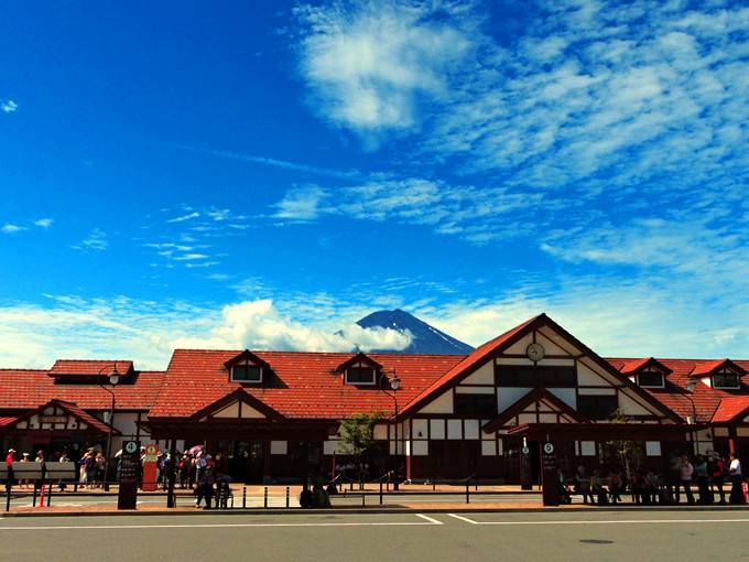 紅瓦白牆的河口湖駅蓋著日本屋頂富士山