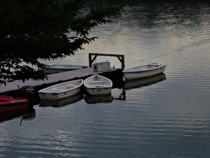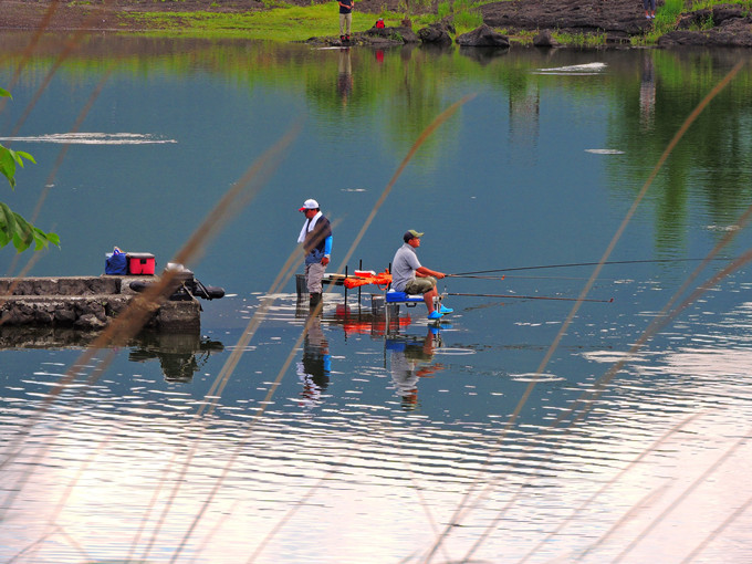 天剛微亮就好多人於靠岸邊處架好專屬的湖中椅子垂釣