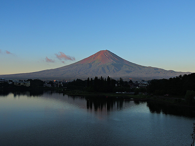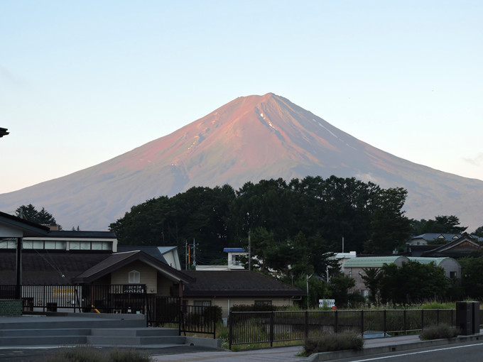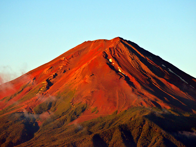 沒有白帽的富士山經陽光照射,成了火紅的赤富士山,如此清晰,今登頂的人一定能看到火山口全景,但,也需接受豔陽曝曬。