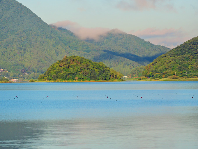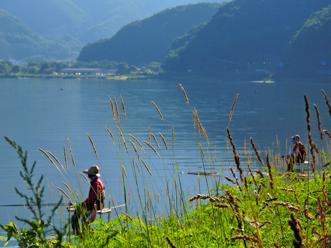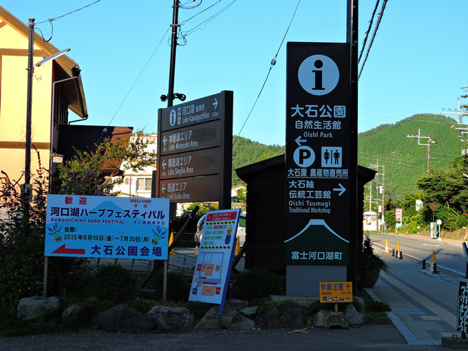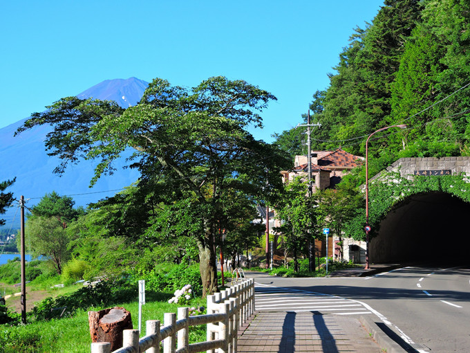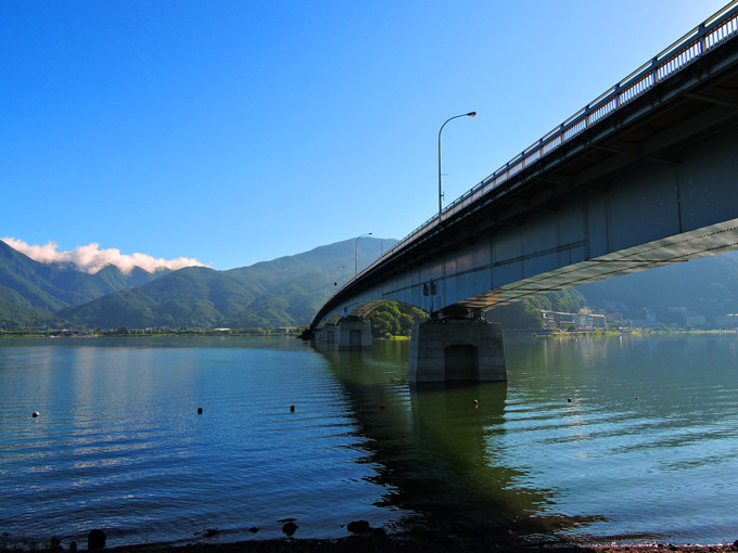 過了河口湖大橋後,有條單車道隨著湖邊蜿轉,我們就沿著單車道,在清新