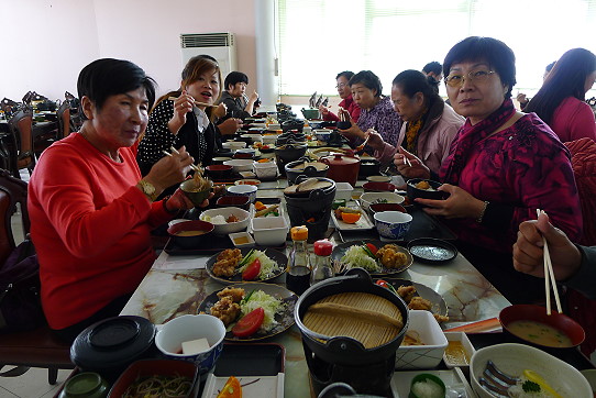 當時大家都被這擺滿一桌的樣子嚇到,心想這麼多的菜怎吃的完,當坐定位後才發現菜量還好啊!這時又討論起來了,哇!這收拾及洗碗的工作,如在家庭裡,那負責洗碗的人不就要累死,每餐都這麼多碗盤。