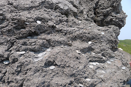 隨處可看到日幣夾在岩泥裡,結果這是被覆蓋而不是塞到縫裡的,可見速度何其快,沒多久這些又要被掩埋掉了。