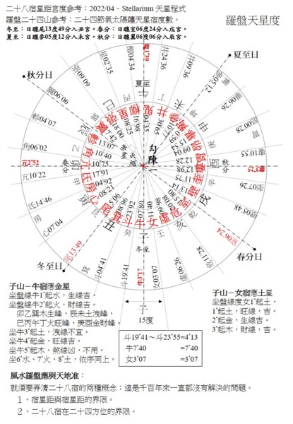 地平、赤道、黃道的坐標都用二十八宿(標示在羅盤上的天星盤線度)。