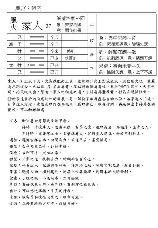 彖曰:家人,女正位乎內,男正位乎外,男女正,天地之大義也。家人有 嚴君焉,父母之謂也。父父,子子,兄兄,弟弟,夫夫,婦婦,而 家道正;正家而天下定矣。