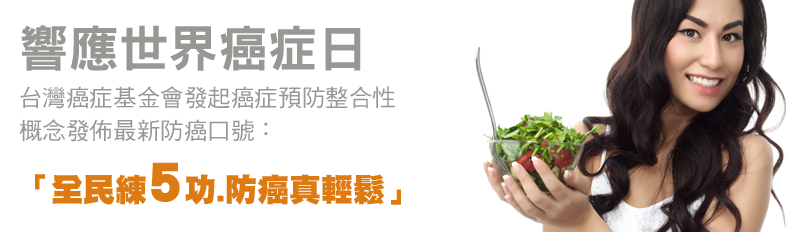 響應世界癌症日 台灣癌症基金會發起癌症預防整合性概念 發佈最新防癌口號 : 「全民練5功.防癌真輕鬆」 |