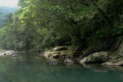 隨機適性地,大夥偶停在水潭林蔭處觀賞溪中的魚兒,封溪護魚已見成效,那一群群舞著銀白肚皮的苦花魚,在陽光折射下閃閃發亮,難怪有水中螢火蟲的稱呼。潭水清澈見底,石礫分布,河床有深有淺,抬頭或見岩層壘壘饒富趣味、或極目溪水轉彎處,蜿蜒景色清幽悅人。看著活潑魚群,我們討論護溪是否包含了禁止餵魚?其實人類是地球的最大破壞者,少了人的干預,大自然自會衍生出一套平衡法則。我們的視野太過短淺,有時候減少破壞污染等負向行為和謹慎善意行為或許是最大的貢獻吧!說到此,猛然想到老子的「大道無情」、「無為」等說法,似乎謀合了人對自然萬物的相應。