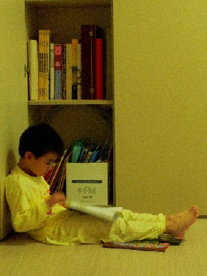 常常呢,我愛打開書櫃門片,盤腿坐著,這本翻翻、那本瞧瞧,好似探望摯友般的殷勤與親密,後來發現小孩也常坐在他的書範圍裡(書架的最下一排),一本本拿出來看著,雖然還認不得字,但書似乎已經是他的朋友了!看見書在他的心中燃起一點小火花,我珍惜地、用以退為進的方式,不主動要求他翻書,相反的把讀睡前書的選書權當作對他的一種獎勵方式,慢慢地讓書在無形中引起小孩的感官經驗是一種愉悅的感受。