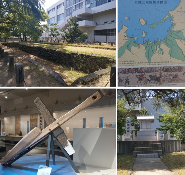 今年5月到福岡博物館參觀,看了「吉卜力工作室大展覽會」、九州歷史與文化介紹和“漢委奴國王”金印後,因氣侯宜人,就徒步到西南學院旁的「西新元寇防壘」。「元寇防壘」是一條綿延20公里的石壘防線,沿著博多灣海岸,西起今津、東至香椎。「西新元寇防壘」位在西新‧百道地區,屬「元寇防壘」中間地帶。這一道石砌的防禦工事,本來並無固定名稱,舊時稱為石築地,直到昭和時期,九州考古學家中山平次郎才將石築地定名為「元寇防壘」,1931年被指定為國家歷史遺址。我們現場看到的「西新元寇防壘」,只短短一段,就掩埋在砂土樹木中。鎌倉時代,今日的博多天神一帶都還在海面下,滄海桑田,原本靠近海邊的灘頭陣地,在歷經數百年的海岸線變動後,現在距博多灣竟有一公里之遙。有意思的是,差點遭到蒙古滅國的日本人,對蒙古人卻頗有好感,我們在防壘旁邊還看到紀念蒙軍的「元寇神社」。