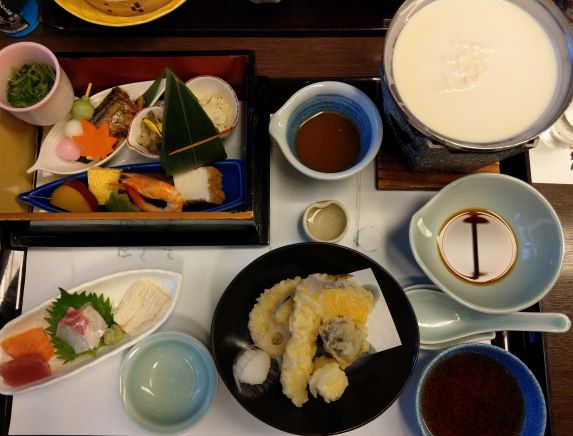 平實而論,「二条苑」的餐飲普普,但在地理位置和歷史滄桑的層層疊疊交織下,吃的就不是舌尖下的美味,而是「高瀬川源流庭園」勾勒出的,發思古之幽情氛圍。餐桌風景較特別的是「豆乳ゆば鍋」DIY,因為京都擁有製作湯葉所必要的優良水質,所以「豆乳ゆば鍋」是「二条苑」最有特色的在地飲食。