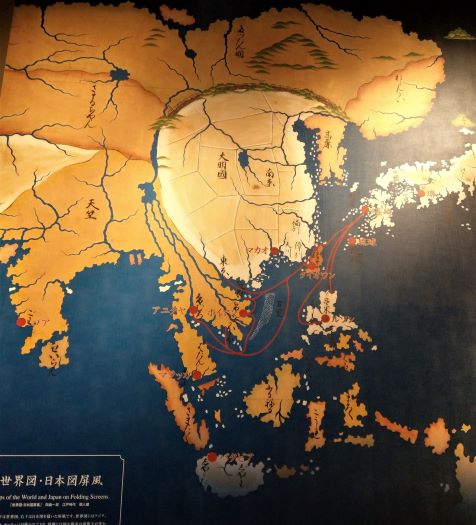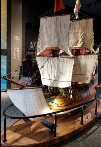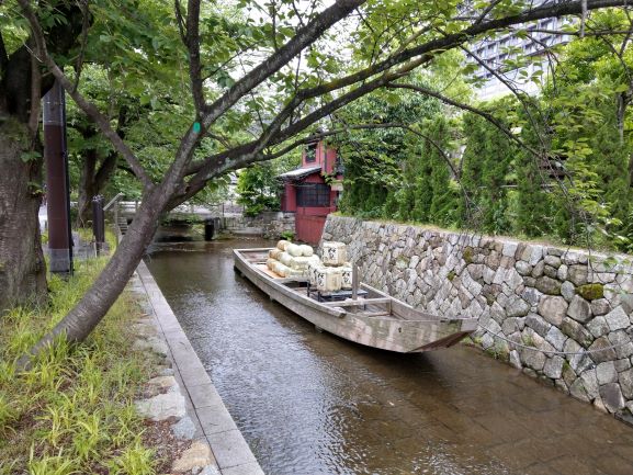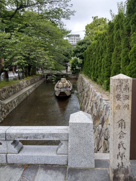 說到二条苑、高瀨川就必須一提角倉了以(1554-1614)。角倉了以從織豐時代就開始從事海外貿易,家康一統天下後,為強化政權、掌握海外通商貿易之利與新技術,於是落實自豊臣秀吉時代就有的朱印船制度,以頒授外貿許可證的方式來掌握海外貿易權,許可證上附有航行目的地,以及批准日期,並蓋有將軍的紅色官印,所以稱為朱印狀,朱印船的船體長度約42公尺,加上船首帆的桅杆可逾60公尺,載重500-750噸。角倉了以在授頒許可證後,即頻繁地與安南國進行朱印船貿易,從1603到1613年,在弟弟宗恂、長男素庵的協力下,累積了巨額的財富。