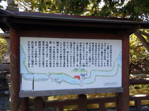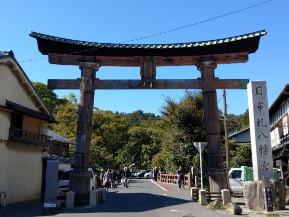 位在八幡堀大杉町的「日牟禮八幡宮」,建於991年,豐臣秀次在建八幡城時,將八幡山上的八幡宮與位於平地的日牟禮八幡宮合併祭祀。八幡城廢城後近江商人仍然持續祭祀日牟禮八幡宮,因此被稱為近江商人守護神。宮內主要供奉的祭神為祭神誉田別尊、息長足姫尊、比賣神,最著名的火祭「左義長祭以及「八幡祭」都已被指定為日本國家無形文化財。