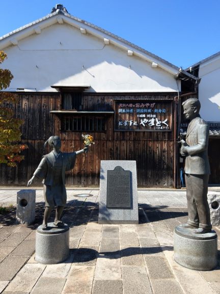 走到新町站旁,看到少女手上拿著新鮮花束的「傳教士與少女」塑像,原來那是將小護士面速力達母軟膏引進近江八幡的William Merrell Vories傳教士塑像,1920年,瓦歷斯取得小護士面速力達母的代理授權,在日本成立「近江兄弟社」代理販售,雖然後來近江兄弟社因經營不善,將日本面速力達母以及小護士商標賣給美國 Mentholatum(曼秀雷敦)本公司,但是近江居民感念瓦歷斯對當地的貢獻,特地為他立了塑像。塑像對面就是近江兄弟社,一樓設了一個小小的資料館,裡面展示歷史老照片,也有相關商品的展示。