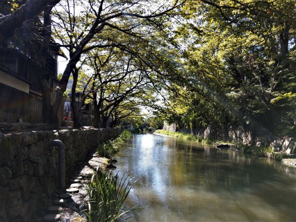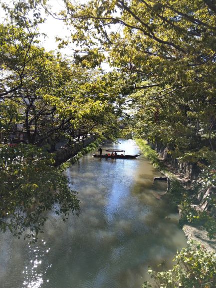 朝八幡山方向走就到了八幡堀。陽光下,空氣裡流蕩著各種氣味,溫柔地在風裡遠遠近近重重疊疊,我們沿著長長水道旁的石疊小路散步,就這般漫無目的的,只是隨意晃蕩。綠樹蔥蘢成蔭,處處光影迷離,恍惚間,搖槳蕩舟泛起的層層漣漪,逐漸變成一片波光細碎散去,悠緩低訴歷史裡的風起雲湧、朝代興衰、刀刃血痕。