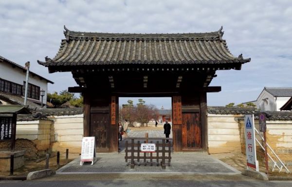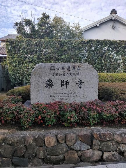 一月的奈良散策,我們離開唐昭提寺後,沿著由奈良觀光協會規劃的「歷史之道」慢慢散步,街道盡頭就是藥師寺的「與樂門」,門邊有一塊「法相宗大本山 藥師寺」大石碑。