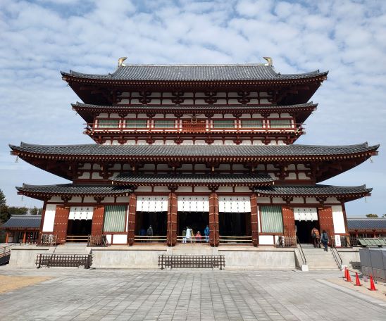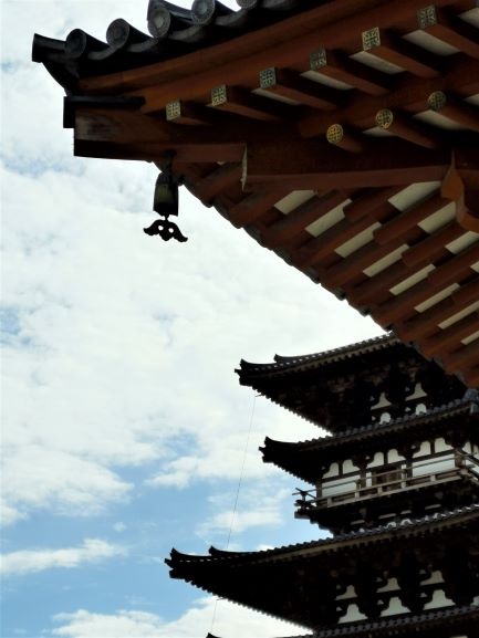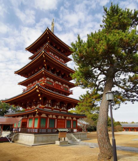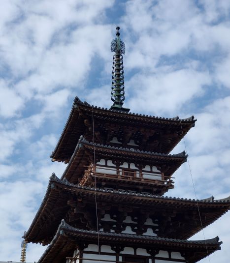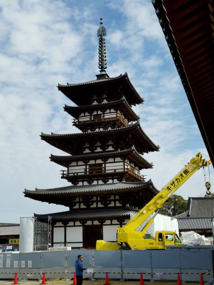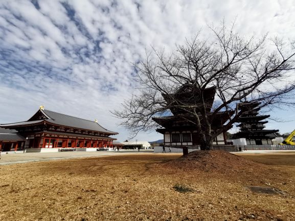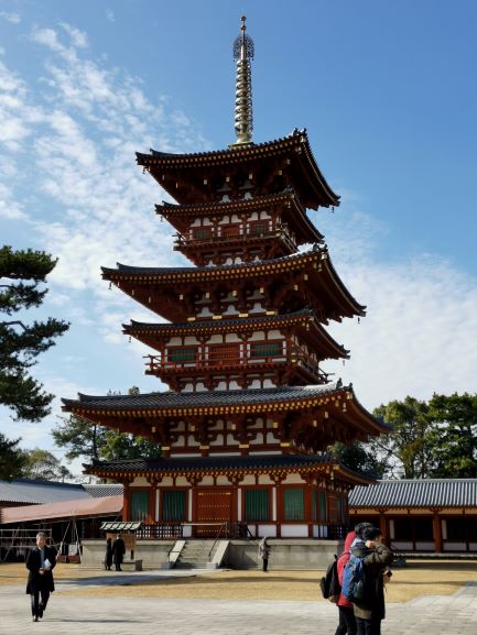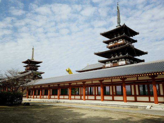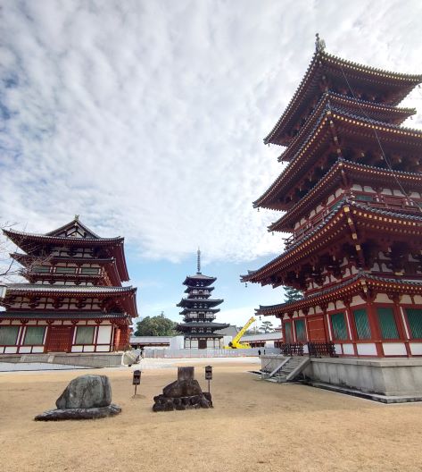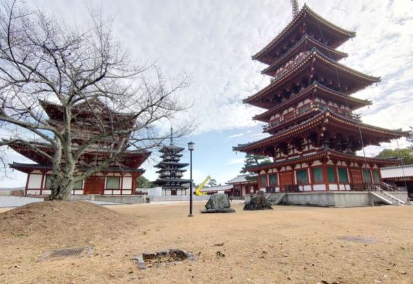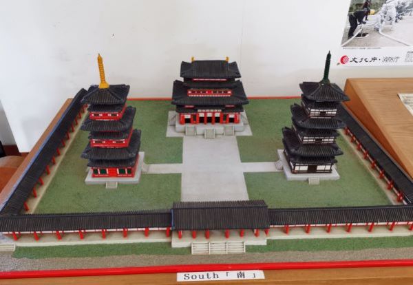 矗立在「金堂」兩邊的是「東塔」及「西塔」,這是日本最早的雙塔單金堂布局。佛教早期(印度石窟時代),寺院以塔為中心,四周圍繞迴廊,到了中國南北朝時期,變成佛塔和大殿並列為中心,之後塔的位置往兩側移動,甚至出現藥師寺雙塔單金堂布局。