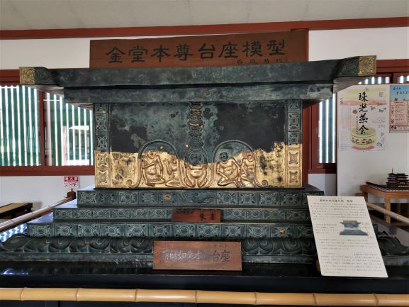 復興後的金堂重現紅色與綠色搭配的堂宇建築,屋頂採用大面積的「裳階」,外觀華麗氣派。堂內的「藥師三尊像」,中央主尊為「藥師琉璃光如來」(高254.7公分),右邊是手持日輪的「日光菩薩」立像(高317.3公分),左邊是手持月輪的「月光菩薩」立像(高315.3公分) ,三尊像是白鳳時代的文化遺蹟,深受初唐藝術影響,佛像面部圓潤、體態豐腴,日月光菩薩微有小腹。其中藥師如來的台座,刻有希臘的葡萄唐草花紋、印度力神浮雕、波斯的蓮花圖案花紋與中國之青龍、朱雀、白虎與玄武四象雕刻,被視為日本當時東西文化交流的例證,也是國寶級重要文物。
