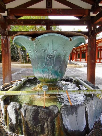 藥師寺中門旁有一座造型頗具趣味的手水洗,其造型是倒掛鐘形蓮花瓣,水由間隙中流下,建造年代為「昭和五十一 辰歲」。