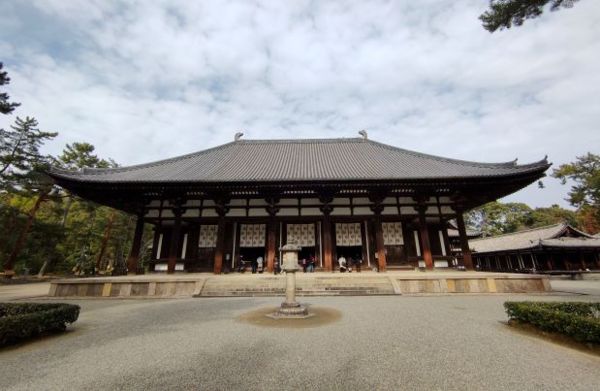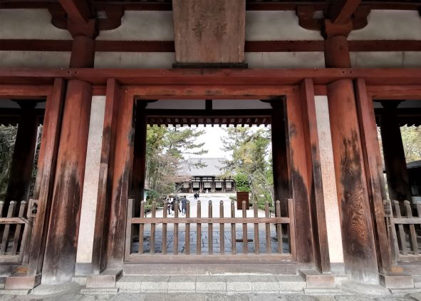 1963年時,以鑒真1200周年忌日為契機而重建的南大門,是日本現存最大的天平建築。南大門為切妻造建物,樑和柱都漆成硃紅色,大門上方敕額中的「唐昭提寺」四字為豎排雙鉤體,據寺院文獻記載,是孝謙天皇(749-758年在位)根據鑒真帶來的王羲之書法模仿書寫而成,不過這塊牌匾為複製品,製作於八世紀的真品保存在新寶藏庫內。