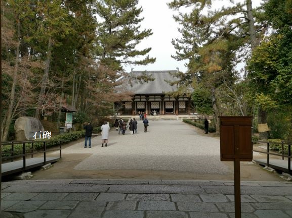 從南大門即可望見金堂,二處相距約50公尺左右,我們購票後從左邊邊門入內,世界文化遺產「古都奈良之文化財-唐招提寺」的大石碑立於左邊園內。